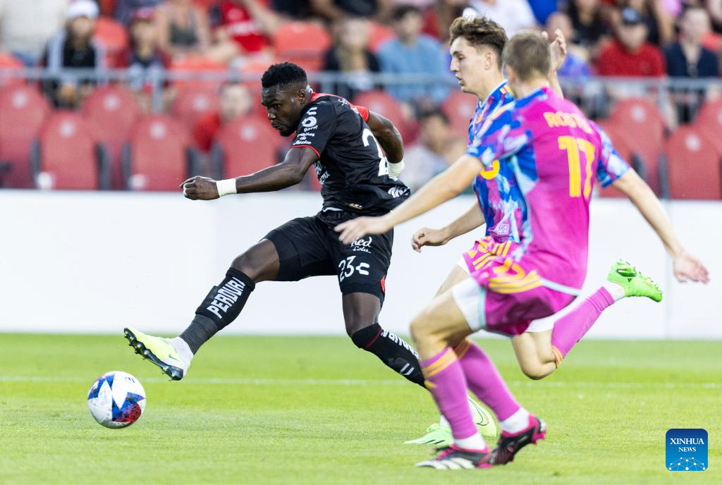 Jordy Josue Caicedo Medina (L) of Atlas FC shoots during the 2023 Leagues Cup match between Toronto FC and Atlas FC at BMO Field in Toronto, Canada, on July 30, 2023. (Photo by Zou Zheng/Xinhua)