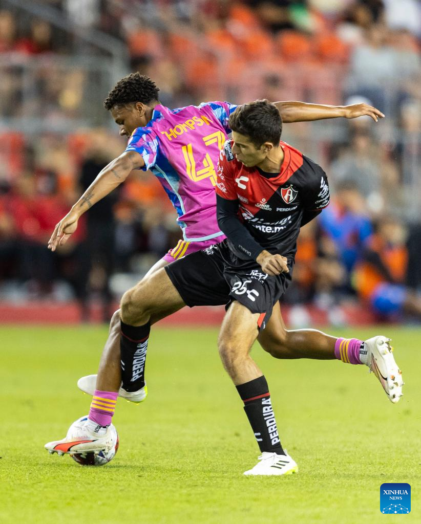 Kosi Thompson (L) of Toronto FC vies with Victor Hugo Rios De Alba of Atlas FC during the 2023 Leagues Cup match between Toronto FC and Atlas FC at BMO Field in Toronto, Canada, on July 30, 2023. (Photo by Zou Zheng/Xinhua)
