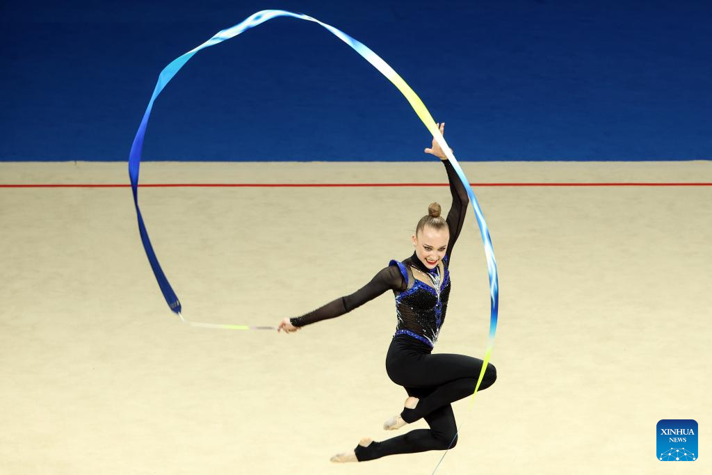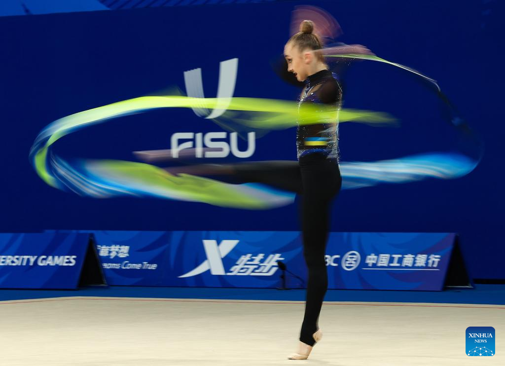 Khrystyna Pohranychna of Ukraine competes during the Rhythmic Gymnastics Individual Ribbon Final at the 31st FISU Summer World University Games in Chengdu, southwest China's Sichuan Province, July 31, 2023. (Xinhua/Zhang Liyun)