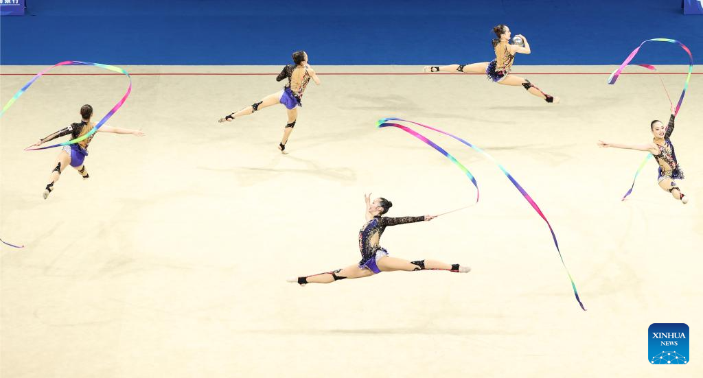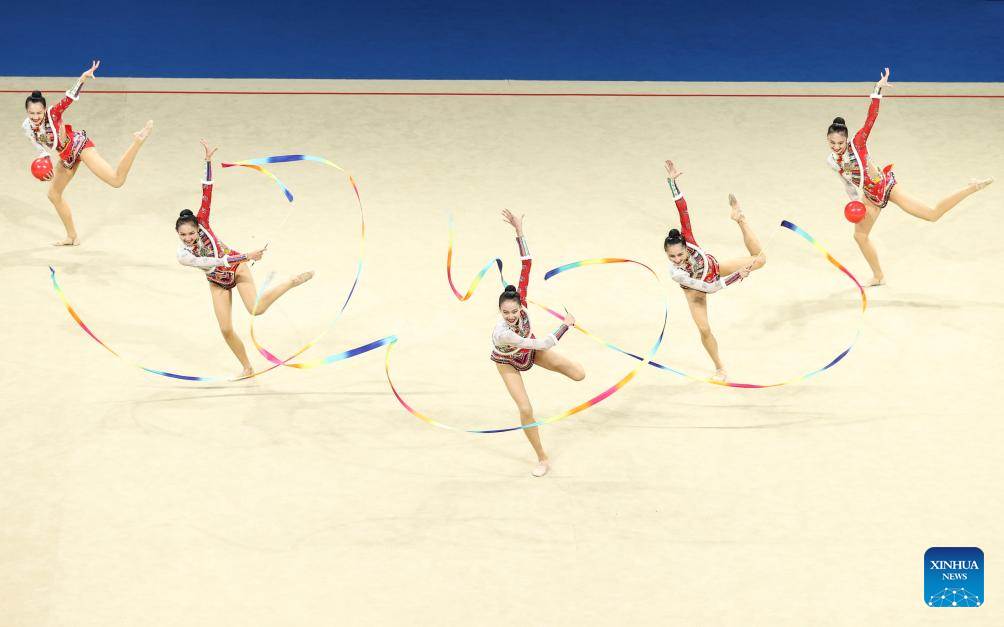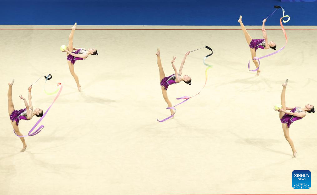 Athletes of Team China compete during the Rhythmic Gymnastics Group 3 Ribbons & 2 Balls final at the 31st FISU Summer World University Games in Chengdu, southwest China's Sichuan Province, July 31, 2023. (Xinhua/Wang Jingqiang)
