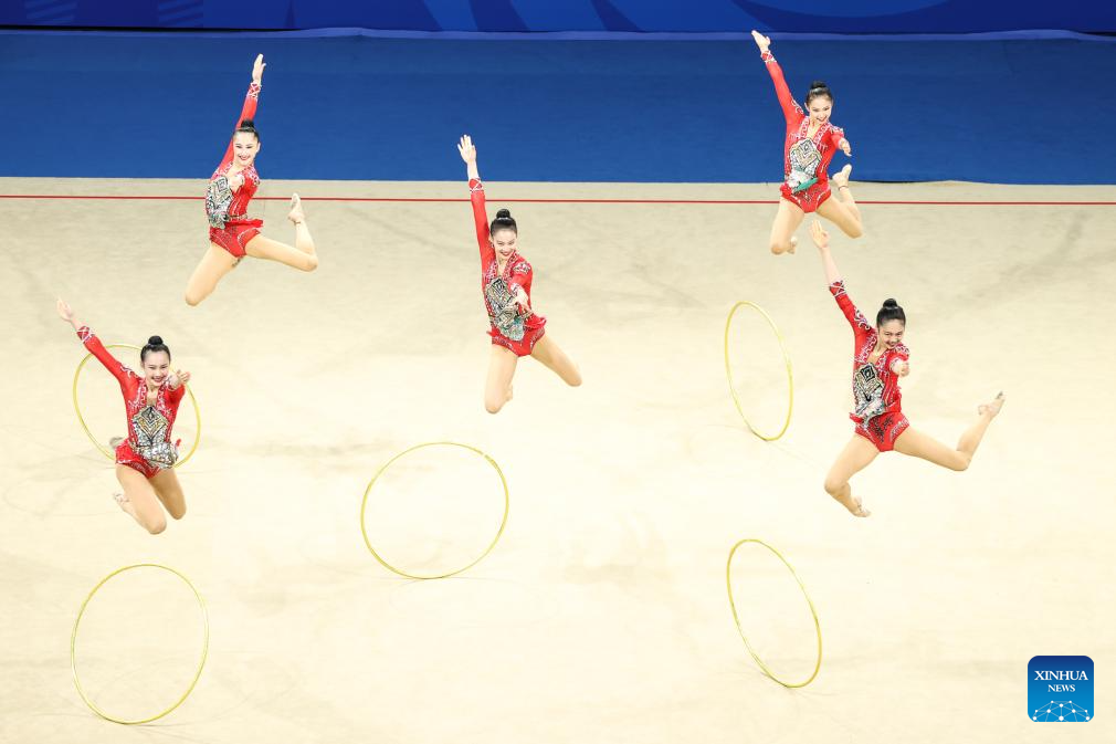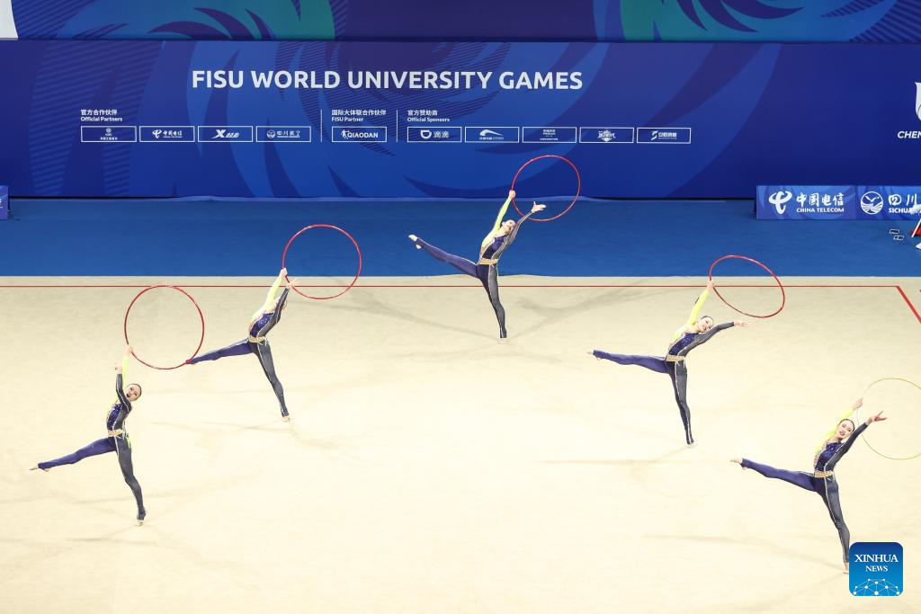 Athletes of China compete during the Rhythmic Gymnastics Group 5 Hoops at the 31st FISU Summer World University Games in Chengdu, southwest China's Sichuan Province, July 31, 2023. (Xinhua/Zhang Liyun)