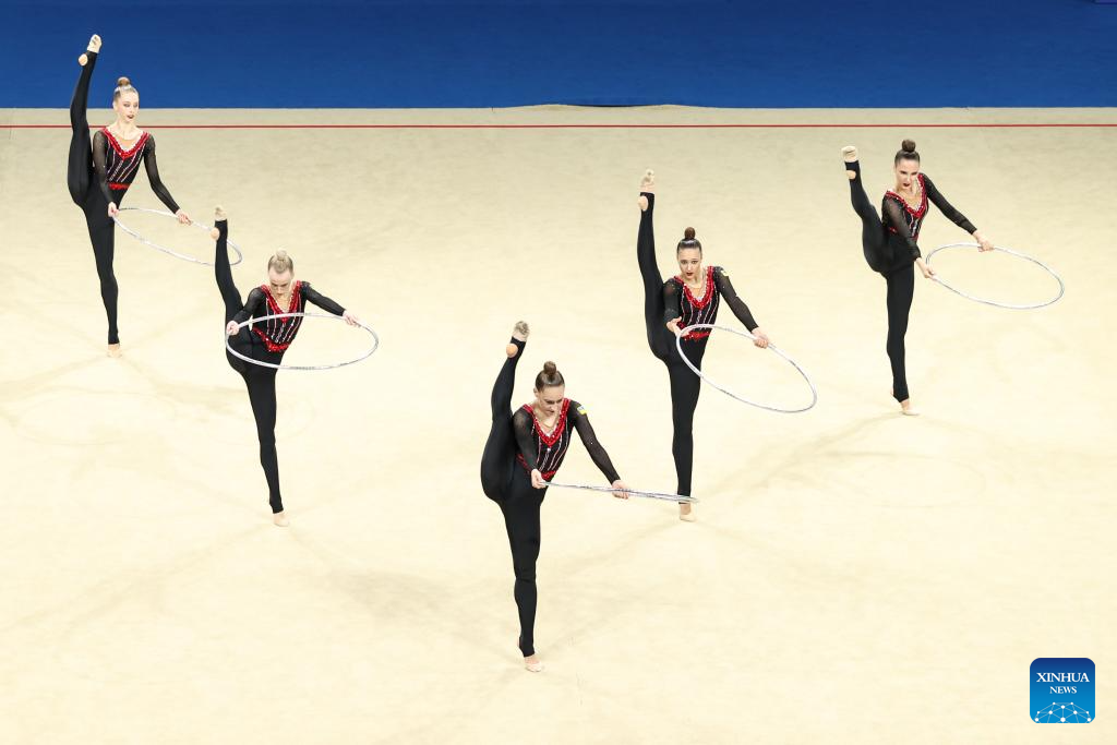 Athletes of Ukraine compete during the Rhythmic Gymnastics Group 5 Hoops at the 31st FISU Summer World University Games in Chengdu, southwest China's Sichuan Province, July 31, 2023. (Xinhua/Zhang Liyun)