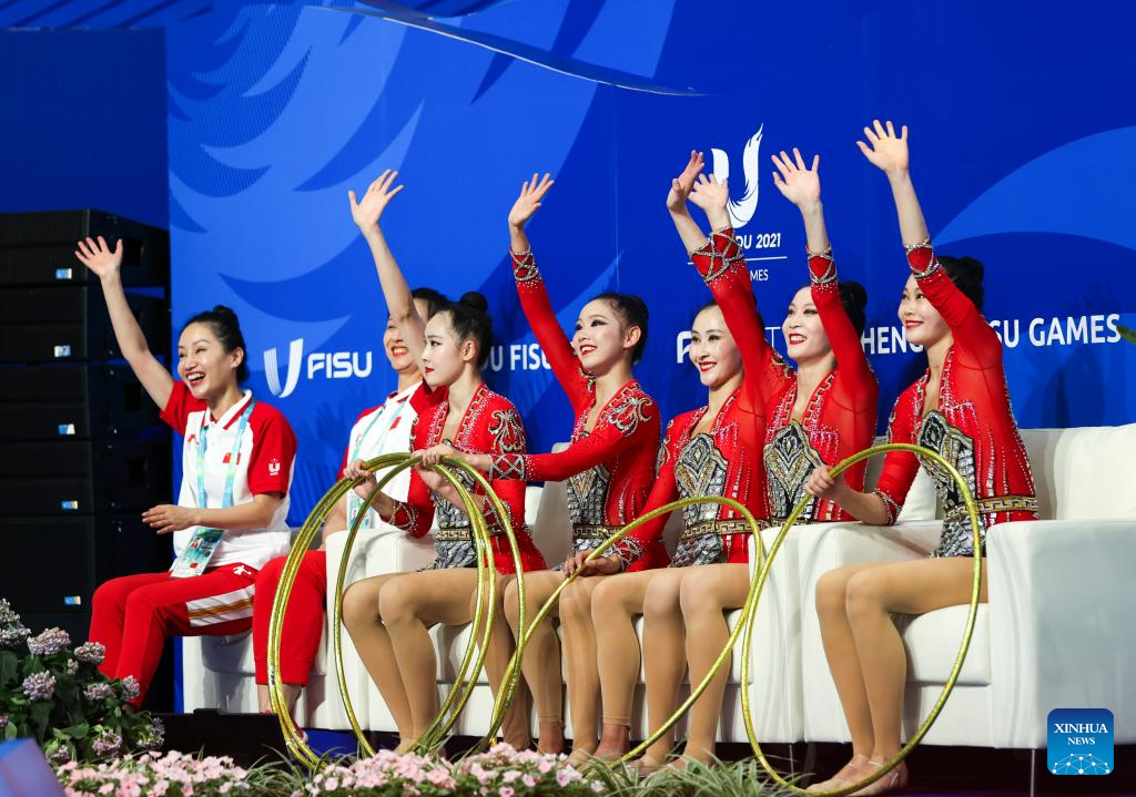 Athletes and coaches of China wave to spectators after competing in the Rhythmic Gymnastics Group 5 Hoops at the 31st FISU Summer World University Games in Chengdu, southwest China's Sichuan Province, July 31, 2023. (Xinhua/Wang Jingqiang)