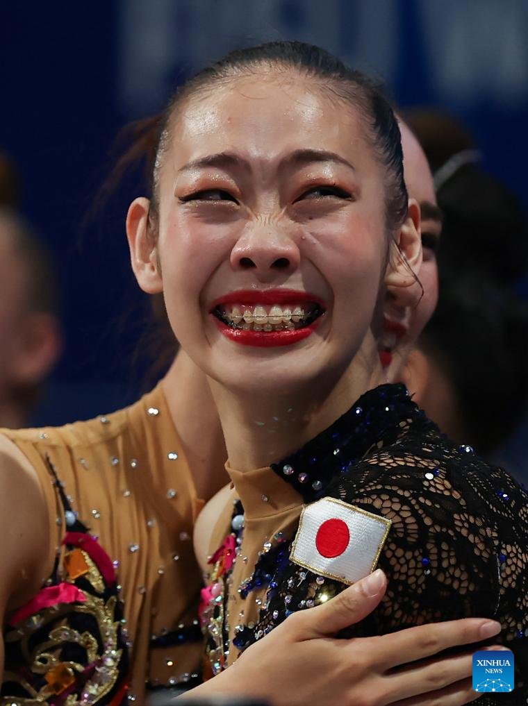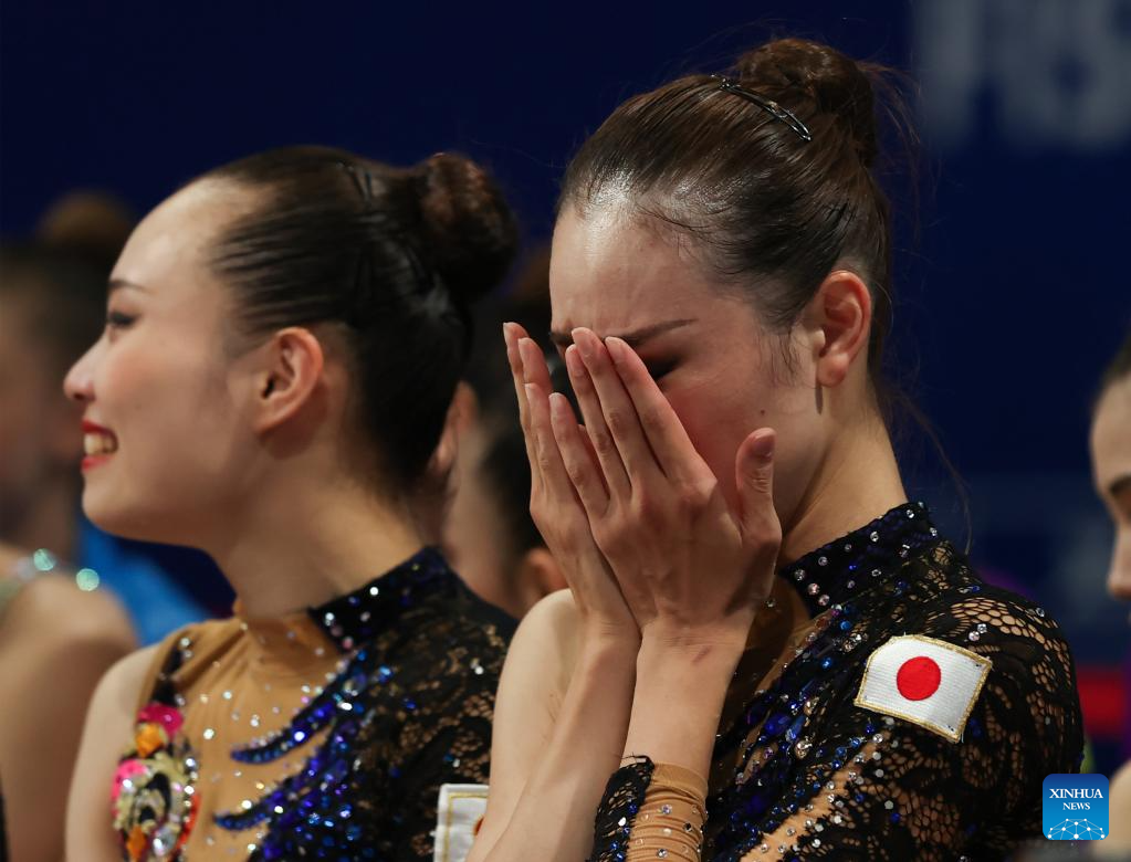 Athletes of Team Japan react during the Rhythmic Gymnastics Group 3 Ribbons & 2 Balls final at the 31st FISU Summer World University Games in Chengdu, southwest China's Sichuan Province, July 31, 2023. (Xinhua/Wang Jingqiang)