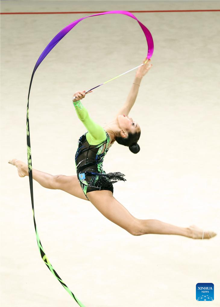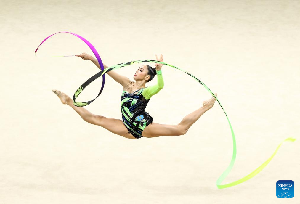 Elzhana Taniyeva of Kazakhstan competes during the Rhythmic Gymnastics Individual Ribbon Final at the 31st FISU Summer World University Games in Chengdu, southwest China's Sichuan Province, July 31, 2023. (Xinhua/Zhang Liyun)
