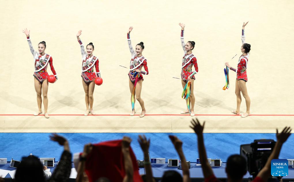 Athletes of Team China wave to the spectators during the Rhythmic Gymnastics Group 3 Ribbons & 2 Balls final at the 31st FISU Summer World University Games in Chengdu, southwest China's Sichuan Province, July 31, 2023. (Xinhua/Zhang Liyun)