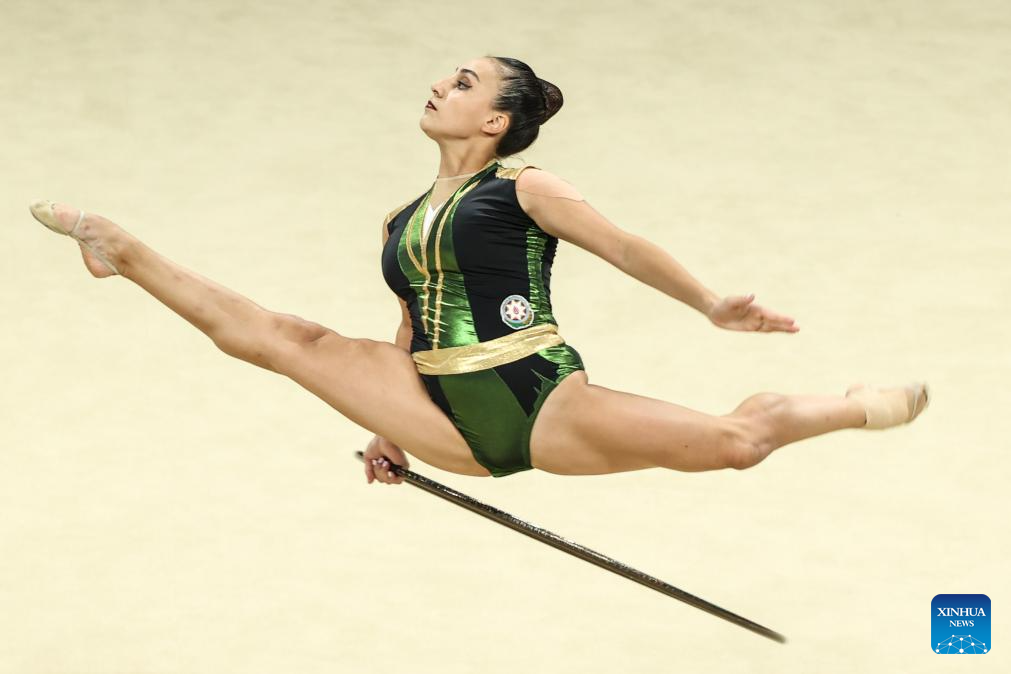Zohra Aghamirova of Azerbaijan competes during the Rhythmic Gymnastics Individual Hoop Final at the 31st FISU Summer World University Games in Chengdu, southwest China's Sichuan Province, July 31, 2023. (Xinhua/Zhang Liyun)