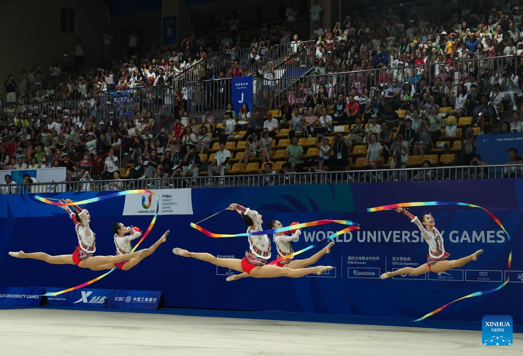 Athletes of Japan compete during the Rhythmic Gymnastics Group 5 Hoops at the 31st FISU Summer World University Games in Chengdu, southwest China's Sichuan Province, July 31, 2023. (Xinhua/Zhang Liyun)