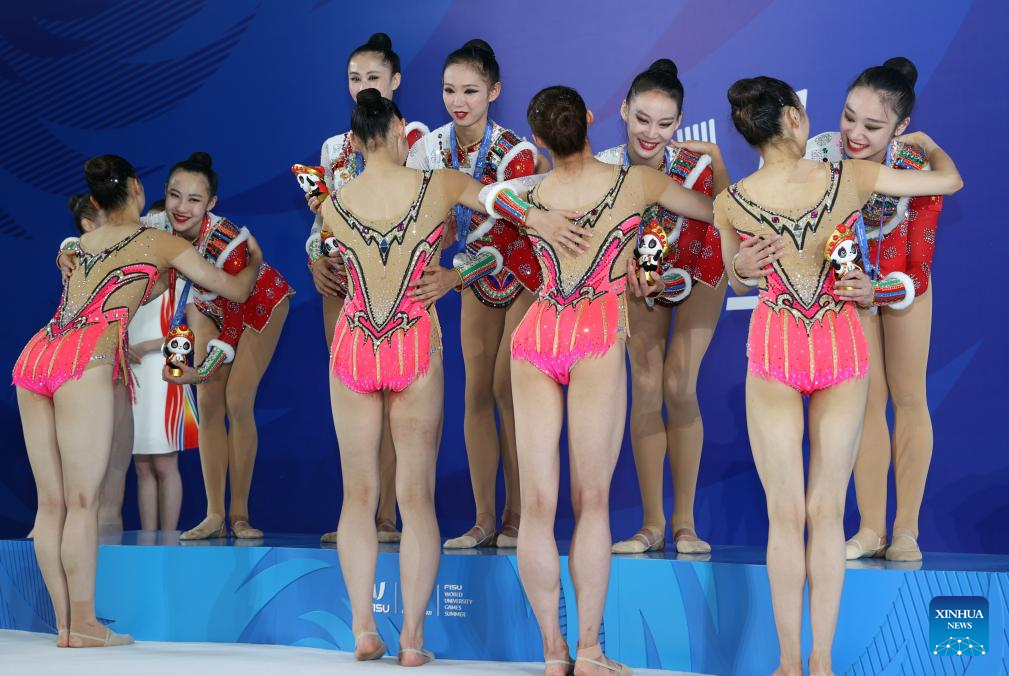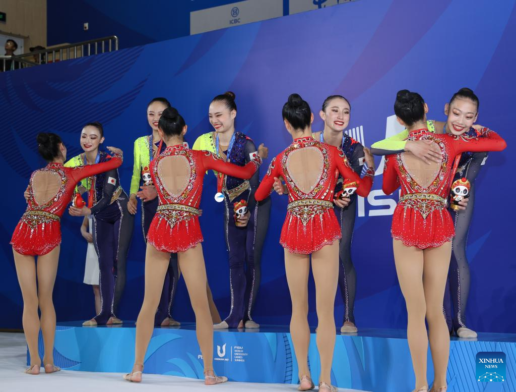 Gold medalists (front) of Team China hug silver medalists of Team Japan during the awarding ceremony of the Rhythmic Gymnastics Group 5 Hoops at the 31st FISU Summer World University Games in Chengdu, southwest China's Sichuan Province, July 31, 2023. (Xinhua/Wang Jingqiang)