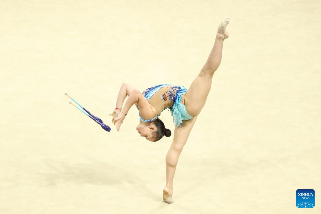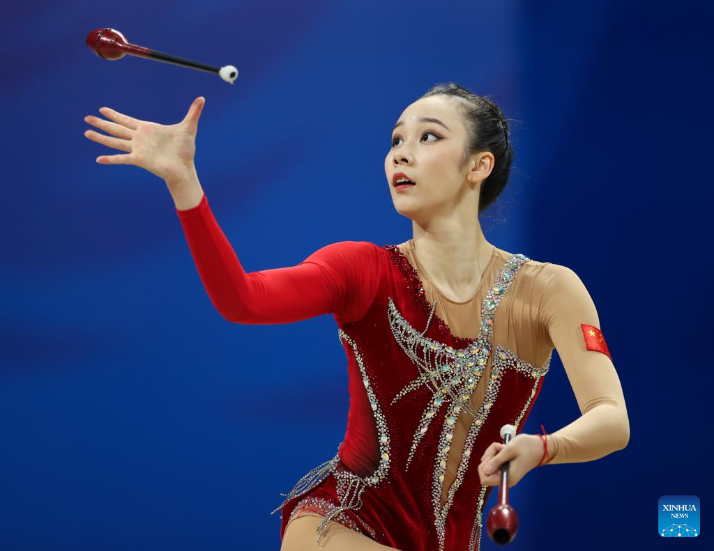 Zhao Yue of China competes during the Rhythmic Gymnastics Individual Clubs Final at the 31st FISU Summer World University Games in Chengdu, southwest China's Sichuan Province, July 31, 2023. (Xinhua/Zhang Liyun)