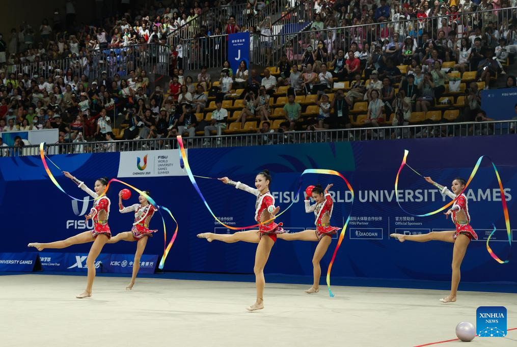 Athletes of Team China compete during the Rhythmic Gymnastics Group 3 Ribbons & 2 Balls final at the 31st FISU Summer World University Games in Chengdu, southwest China's Sichuan Province, July 31, 2023. (Xinhua/Zhang Liyun)