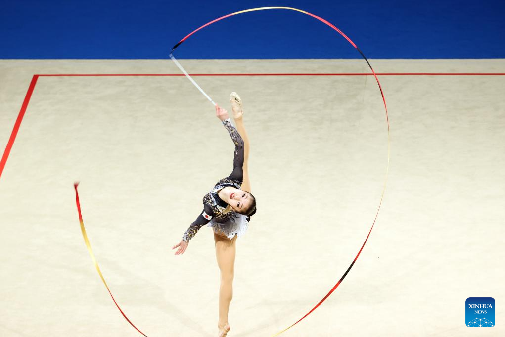 Suzuki Naruha of Japan competes during the Rhythmic Gymnastics Individual Ribbon Final at the 31st FISU Summer World University Games in Chengdu, southwest China's Sichuan Province, July 31, 2023. (Xinhua/Zhang Liyun)