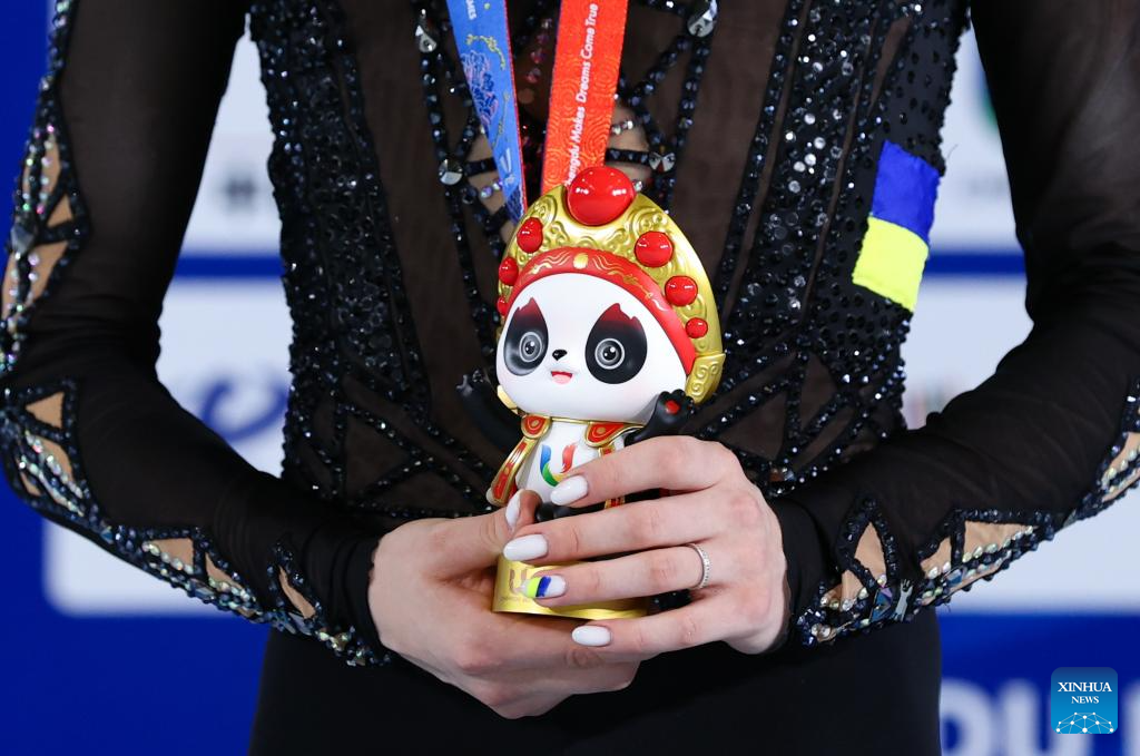 Khrystyna Pohranychna of Ukraine reacts during the awarding ceremony for Rhythmic Gymnastics Individual Hoop at the 31st FISU Summer World University Games in Chengdu, southwest China's Sichuan Province, July 31, 2023. (Xinhua/Wang Jingqiang)