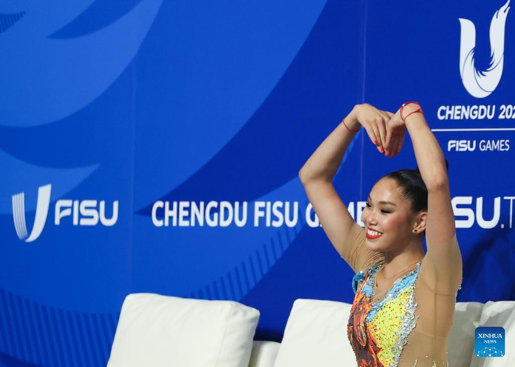 Elzhana Taniyeva of Kazakhstan reacts after her Rhythmic Gymnastics Individual Hoop Final at the 31st FISU Summer World University Games in Chengdu, southwest China's Sichuan Province, July 31, 2023. (Xinhua/Wang Jingqiang)