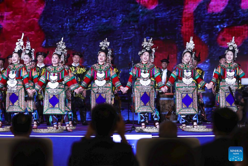 Artists sing songs of Dong ethnic group at the closing ceremony of the Eco Forum Global Guiyang 2023 in Guiyang, southwest China's Guizhou Province, July 9, 2023. (Xinhua/Yang Wenbin)