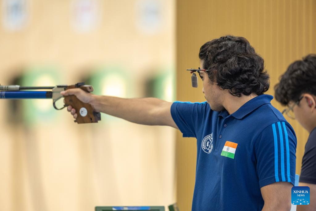 Anmol Jain of India competes during the Shooting Men's 10m Air Pistol Team Final at the 31st FISU Summer World University Games in Chengdu, southwest China's Sichuan Province, Aug. 1, 2023. (Xinhua/Huang Wei)