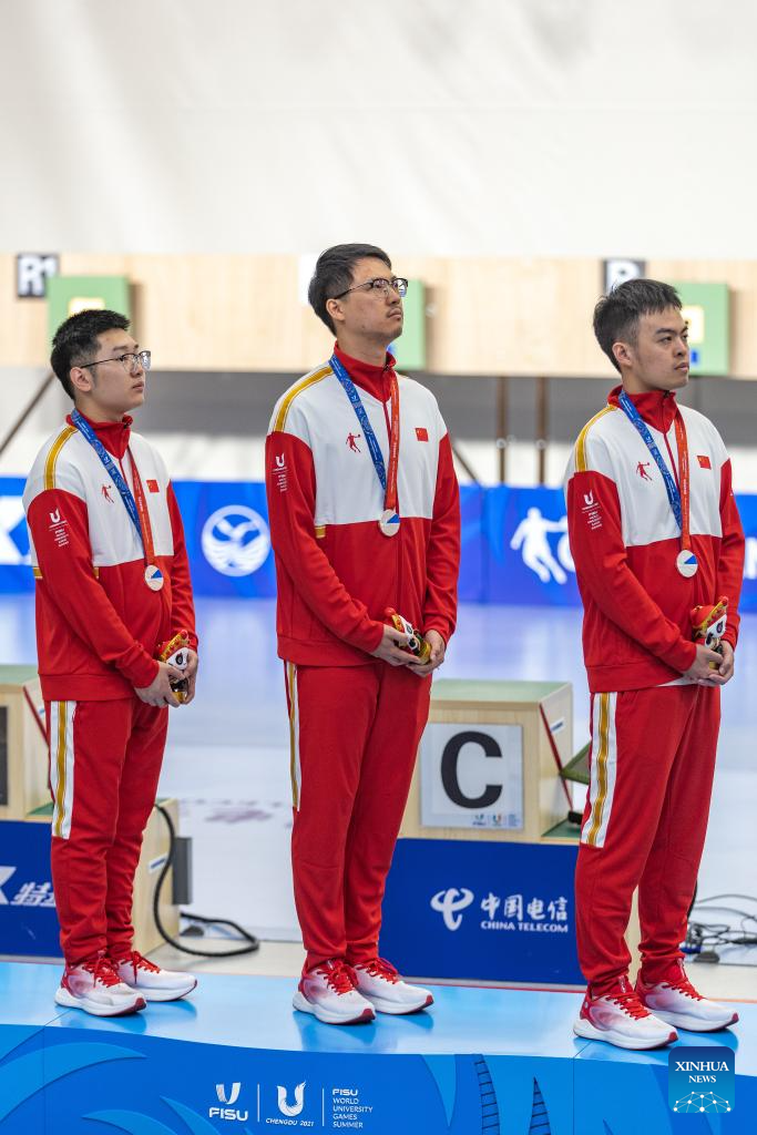 Hu Kai, Xu Zhanyi and Zhang Bingchen (from L to R) of China attend the awarding ceremony for the Shooting Men's 10m Air Pistol Team at the 31st FISU Summer World University Games in Chengdu, southwest China's Sichuan Province, Aug. 1, 2023. (Xinhua/Huang Wei)