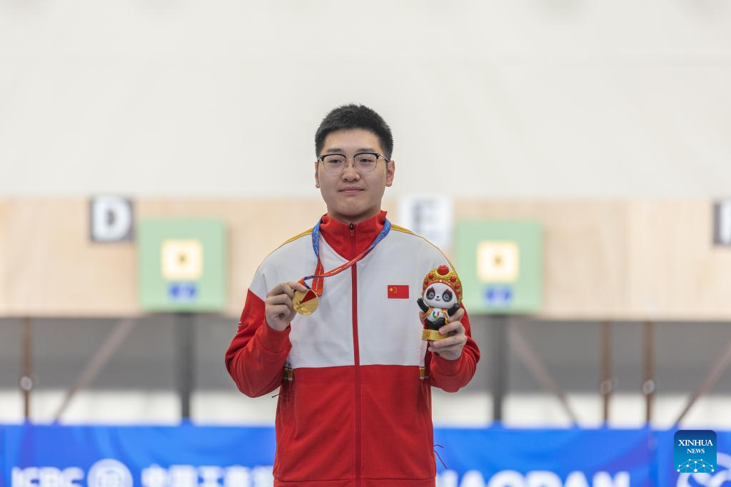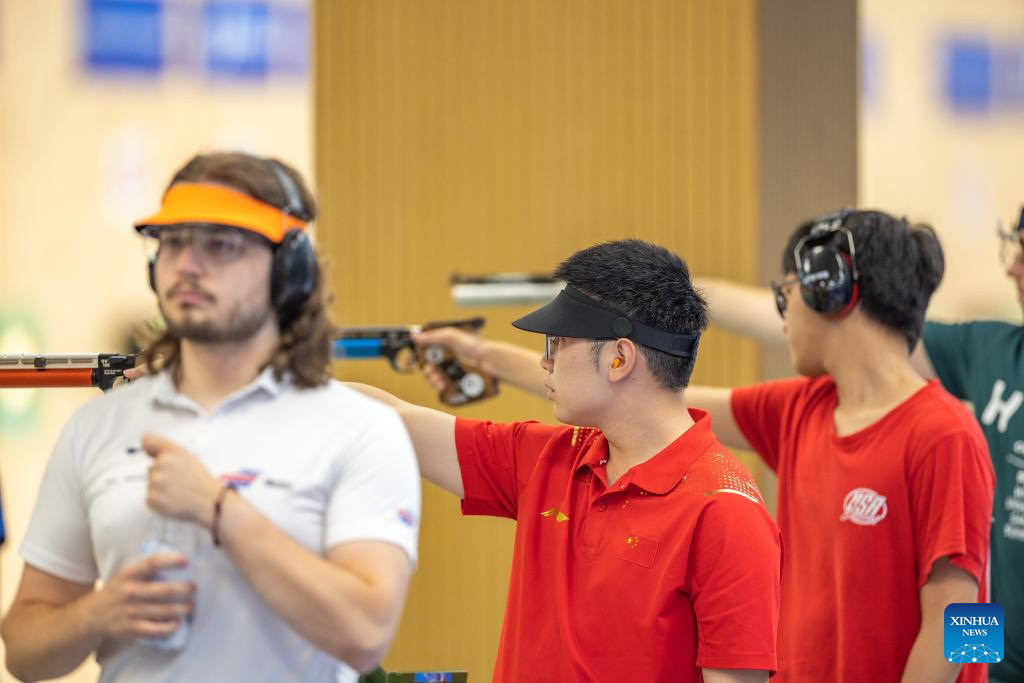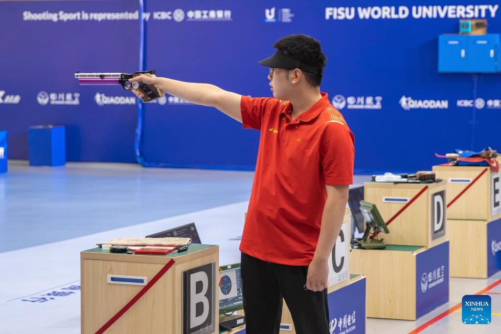 Hu Kai of China competes during the Shooting Men's 10m Air Pistol Final at the 31st FISU Summer World University Games in Chengdu, southwest China's Sichuan Province, Aug. 1, 2023. (Xinhua/Huang Wei)
