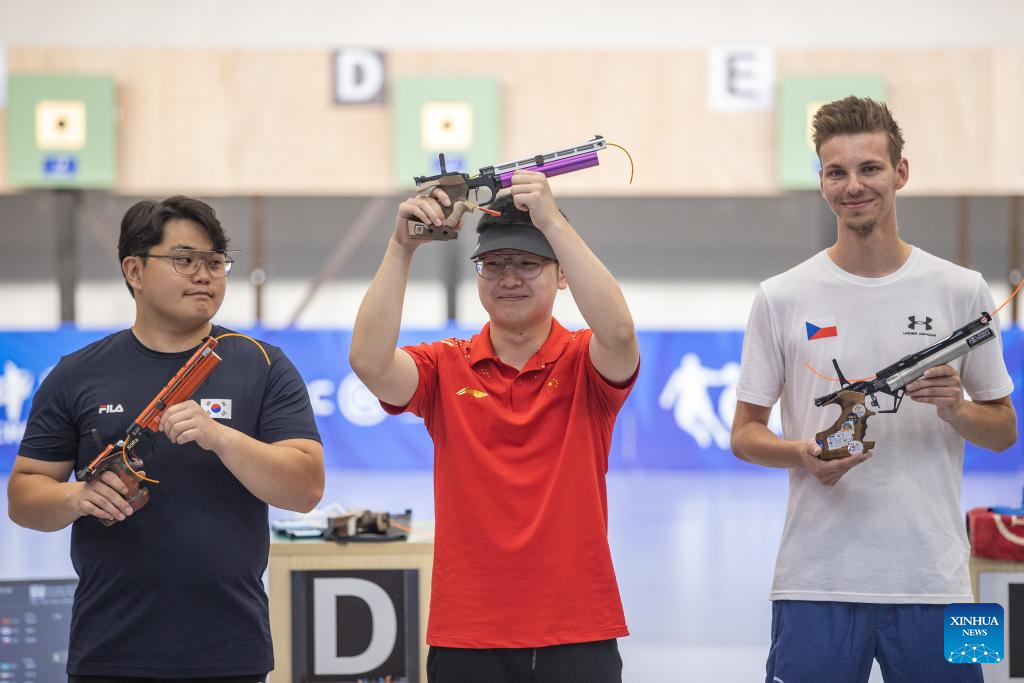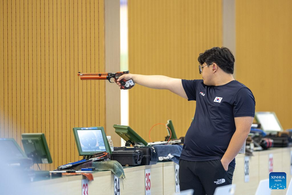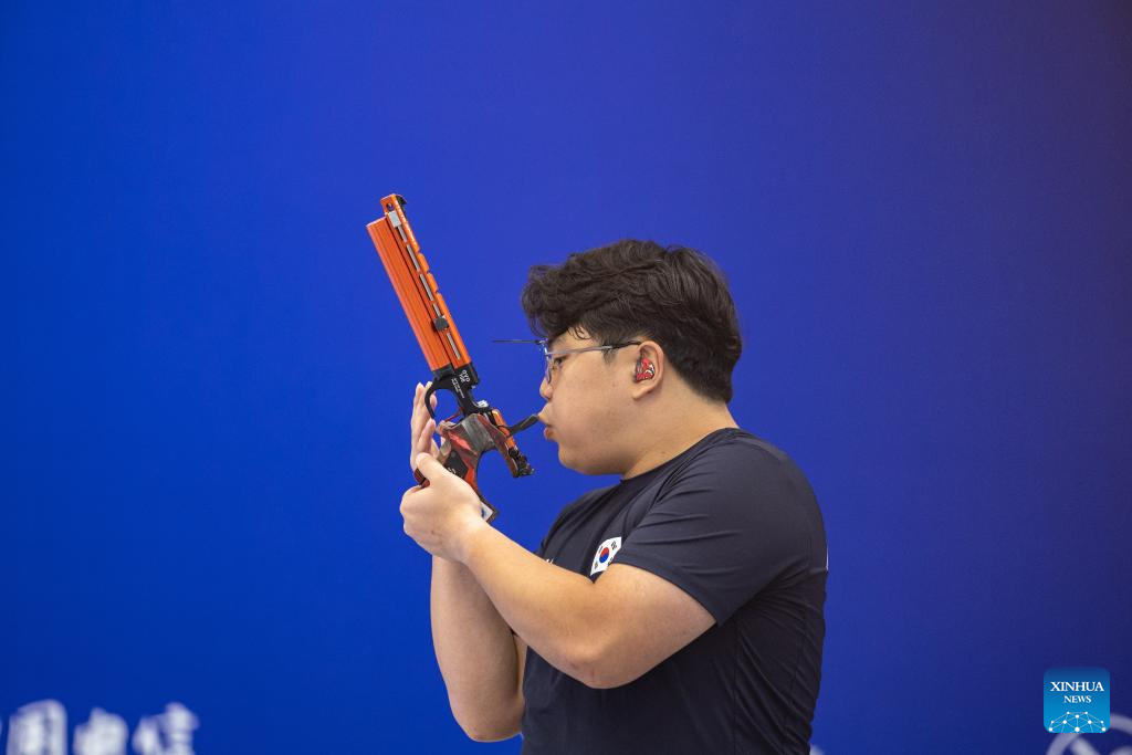 Lim Hojin of South Korea competes during the Shooting Men's 10m Air Pistol Team Final at the 31st FISU Summer World University Games in Chengdu, southwest China's Sichuan Province, Aug. 1, 2023. (Xinhua/Huang Wei)