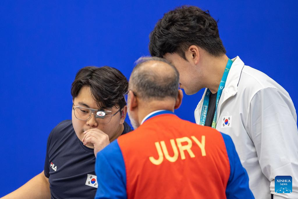 Lim Hojin (1st L) of South Korea talks with the jury during the Shooting Men's 10m Air Pistol Final at the 31st FISU Summer World University Games in Chengdu, southwest China's Sichuan Province, Aug. 1, 2023. (Xinhua/Huang Wei)