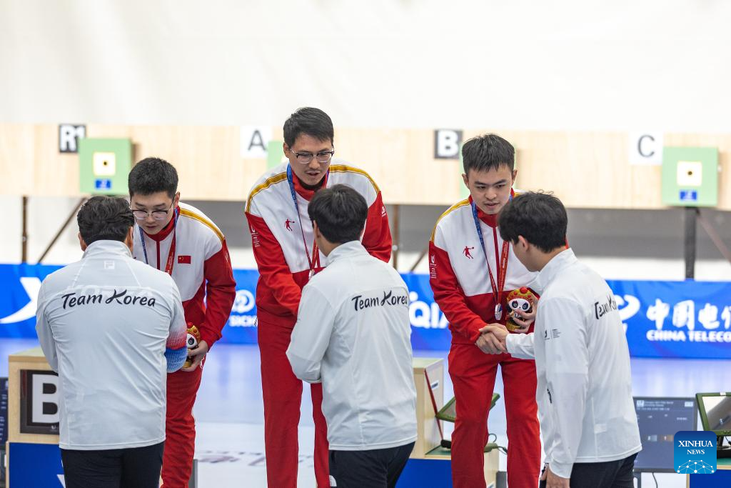 Hu Kai, Xu Zhanyi and Zhang Bingchen (from L to R, top) of China shake hands with members of team South Korea during the awarding ceremony for the Shooting Men's 10m Air Pistol Team at the 31st FISU Summer World University Games in Chengdu, southwest China's Sichuan Province, Aug. 1, 2023. (Xinhua/Huang Wei)