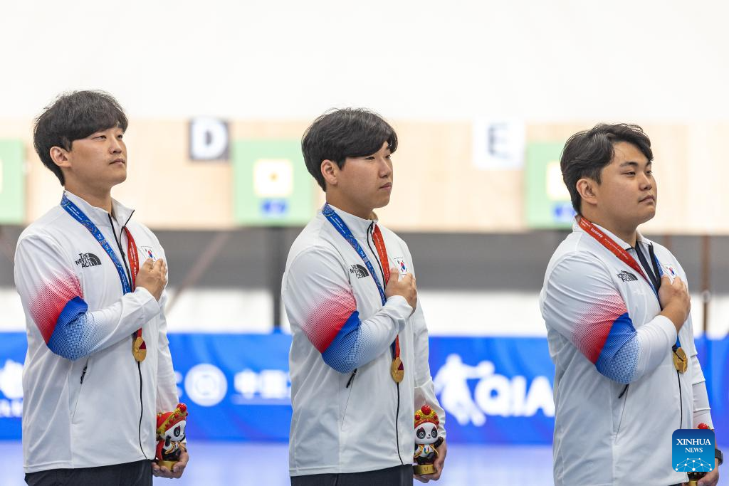 Choe Boram, Lee Wonho and Lim Hojin (from L to R) of South Korea attend the awarding ceremony for the Shooting Men's 10m Air Pistol Team at the 31st FISU Summer World University Games in Chengdu, southwest China's Sichuan Province, Aug. 1, 2023. (Xinhua/Huang Wei)