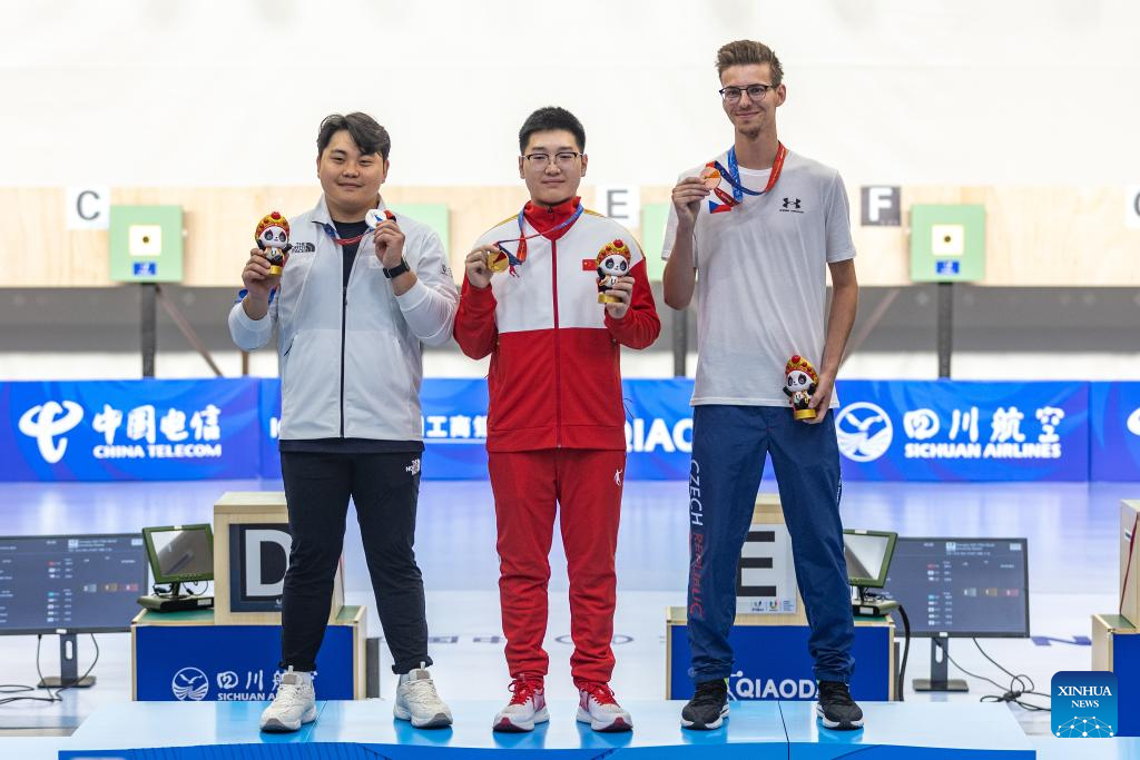 Lim Hojin of South Korea, Hu Kai of China and Pavel Schejbal of the Czech Republic (L to R) react during the awarding ceremony for the Shooting Men's 10m Air Pistol Final at the 31st FISU Summer World University Games in Chengdu, southwest China's Sichuan Province, Aug. 1, 2023. (Xinhua/Huang Wei)