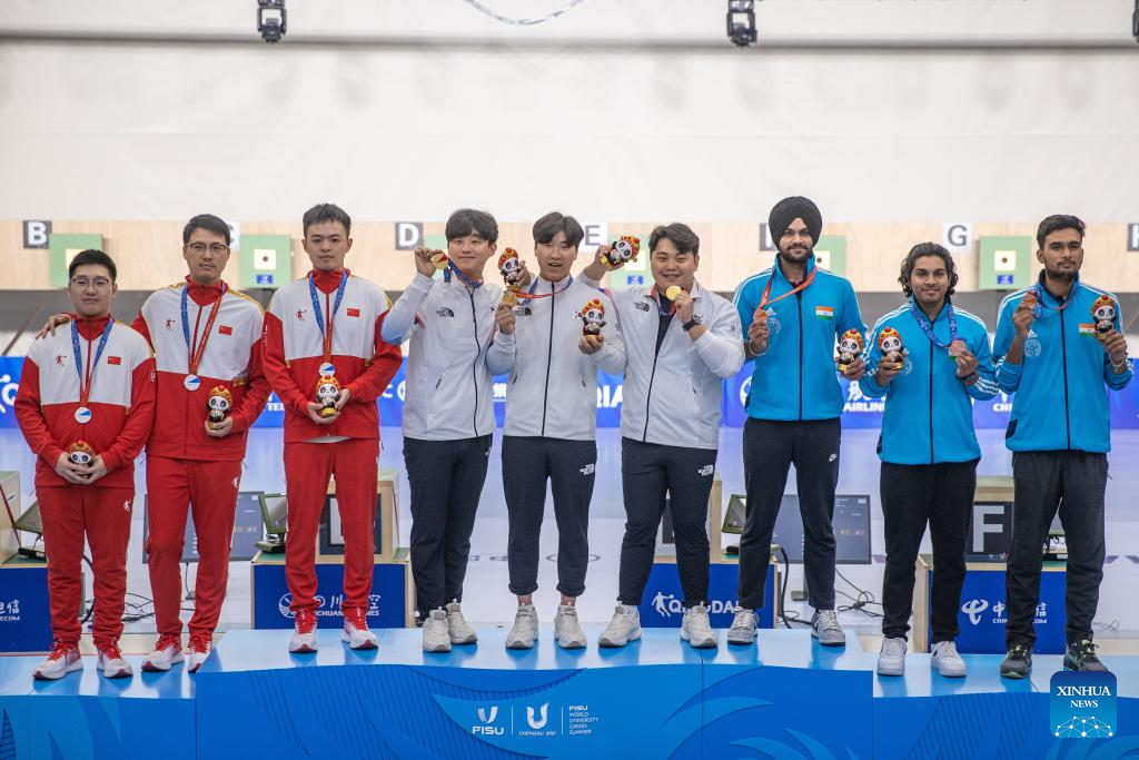 Gold medalists team South Korea (C), silver medalists team China (L) and bronze medalists team India pose during the awarding ceremony for the Shooting Men's 10m Air Pistol Team at the 31st FISU Summer World University Games in Chengdu, southwest China's Sichuan Province, Aug. 1, 2023. (Xinhua/Huang Wei)