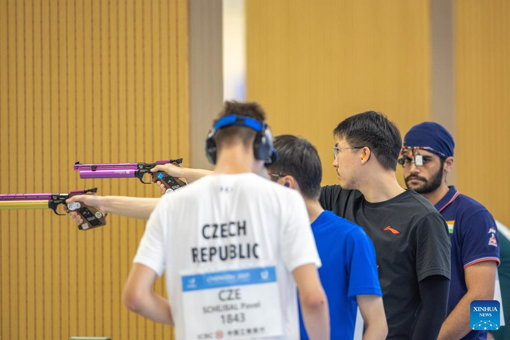 Pavel Schejbal of the Czech Republic competes during the Shooting Men's 10m Air Pistol Final at the 31st FISU Summer World University Games in Chengdu, southwest China's Sichuan Province, Aug. 1, 2023. (Xinhua/Huang Wei)