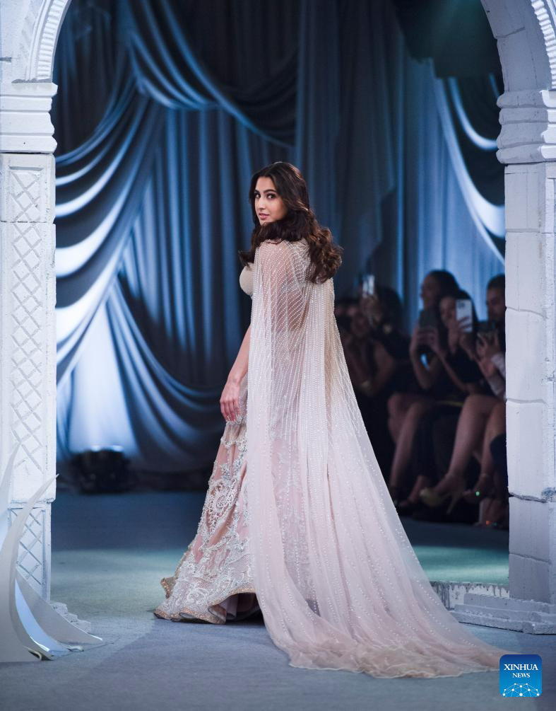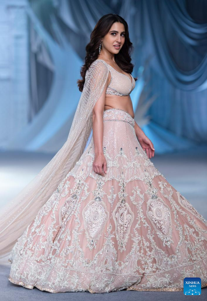 Bollywood actress Sara Ali Khan displays a creation by Indian designers Shantnu and Nikhil during the FDCI India Couture Week 2023 in New Delhi, India, July 31, 2023. (Xinhua/Javed Dar)