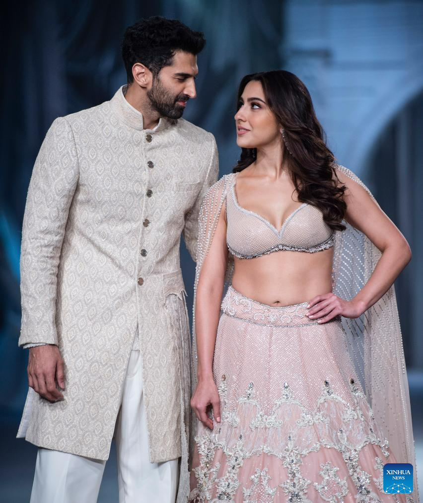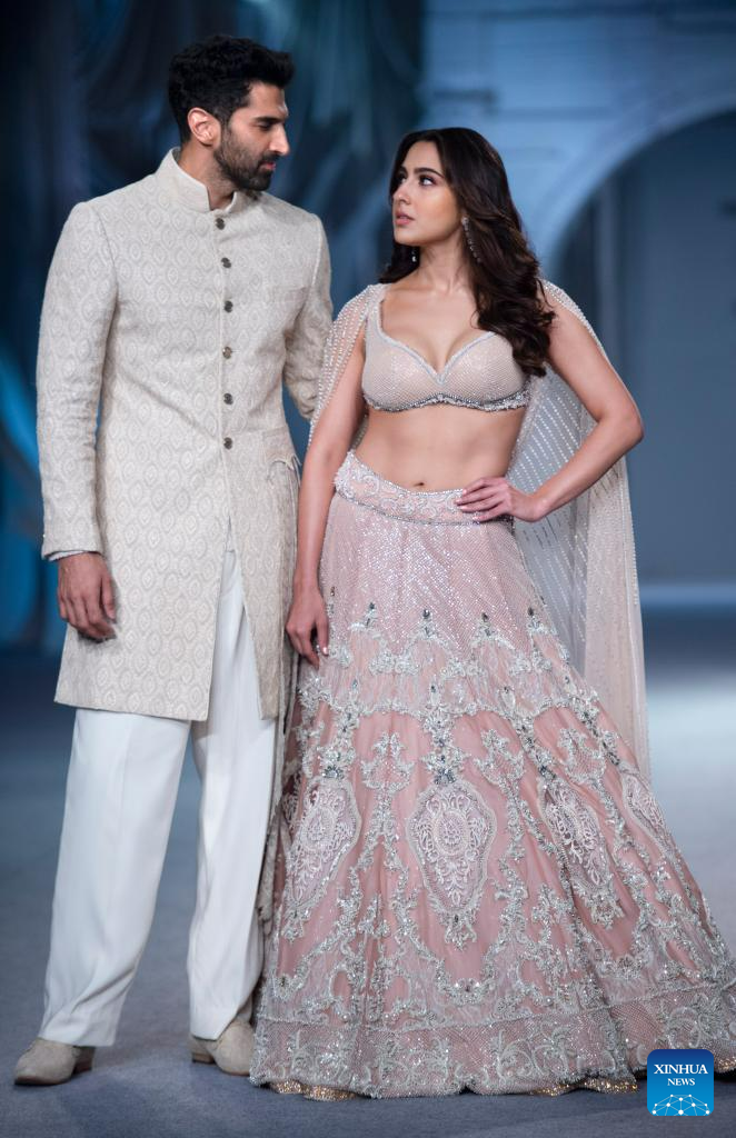 Bollywood actor Aditya Roy Kapur (L) and actress Sara Ali Khan display creations by Indian designers Shantnu and Nikhil during the FDCI India Couture Week 2023 in New Delhi, India, July 31, 2023. (Xinhua/Javed Dar)