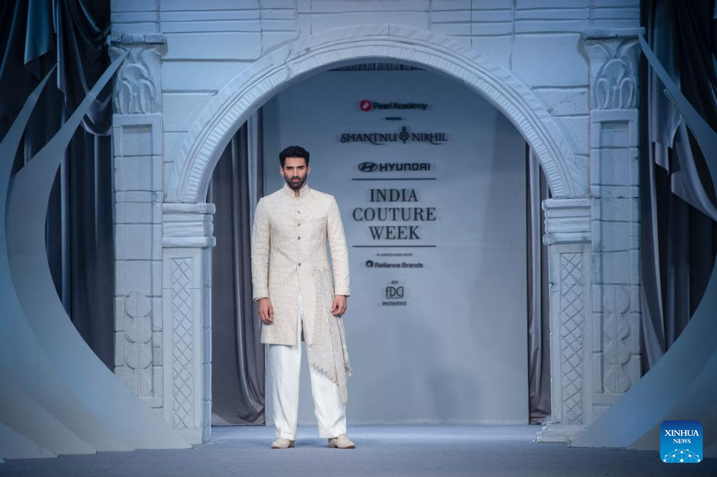 Bollywood actor Aditya Roy Kapur displays a creation by Indian designers Shantnu and Nikhil during the FDCI India Couture Week 2023 in New Delhi, India, July 31, 2023. (Xinhua/Javed Dar)