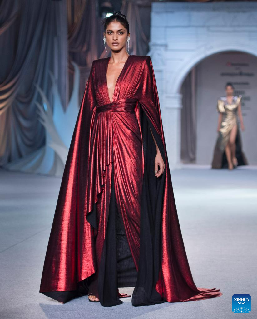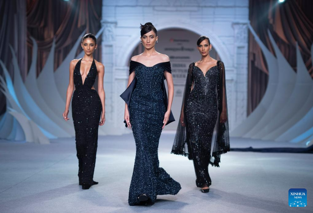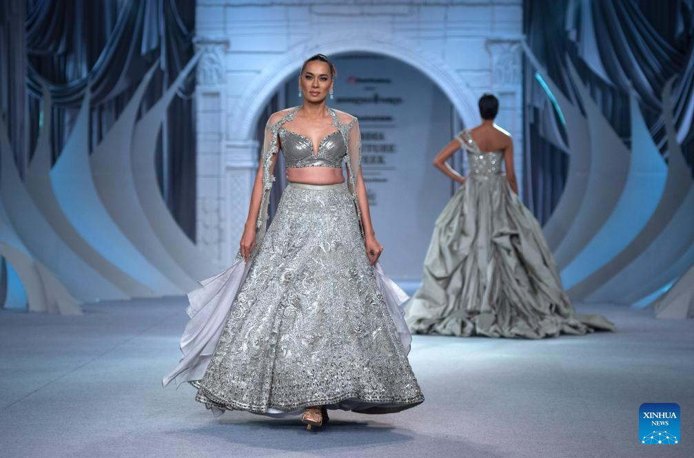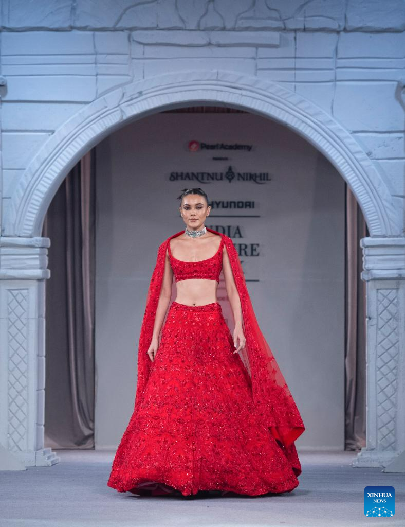 Models display creations by Indian designers Shantnu and Nikhil during the FDCI India Couture Week 2023 in New Delhi, India, July 31, 2023. (Xinhua/Javed Dar)