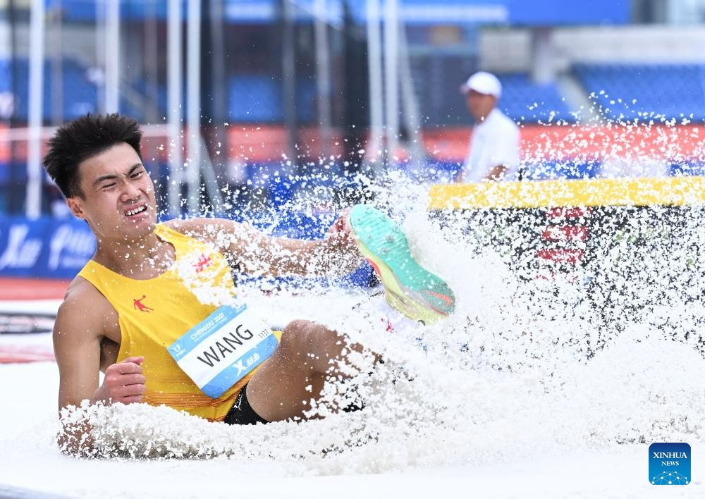 Wang Zhipeng of China celebrates during the long jump event of the Athletics Men's Decathlon competition at the 31st FISU Summer World University Games in Chengdu, southwest China's Sichuan Province, Aug. 2, 2023. (Xinhua/Wang Xi)