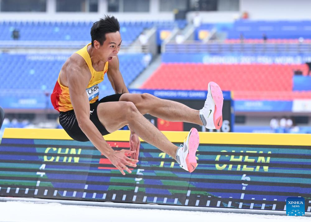 Chen Yesen of China celebrates during the long jump event of the Athletics Men's Decathlon competition at the 31st FISU Summer World University Games in Chengdu, southwest China's Sichuan Province, Aug. 2, 2023. (Xinhua/Wang Xi)