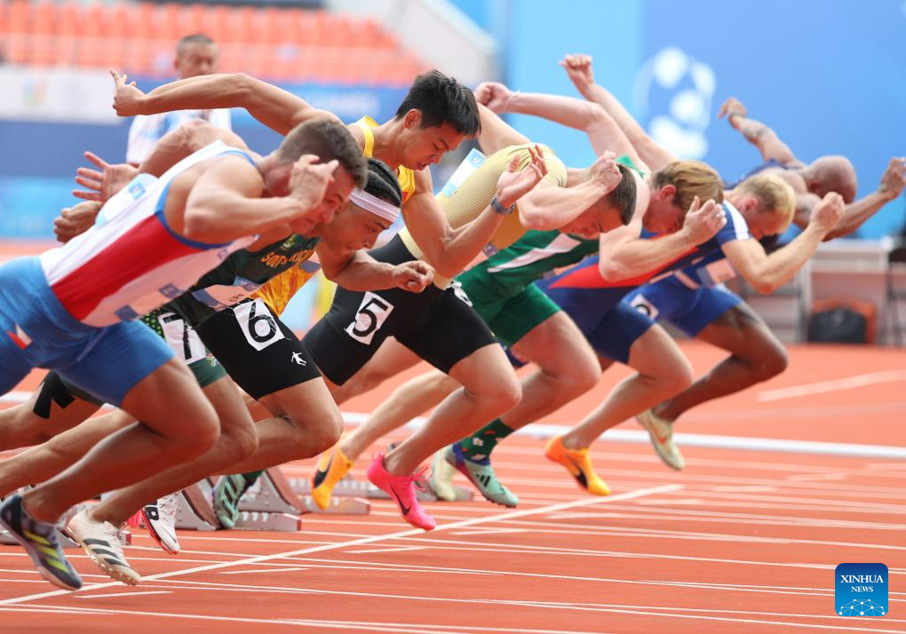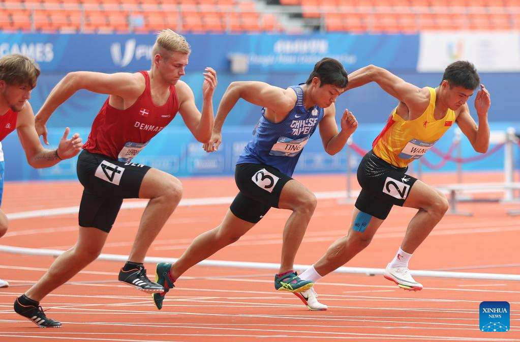 (from L to R) Jesse Isai Perez of South Africa, Wang Zhipeng of China and Jannis Wolff of Germany compete during the 100m event of the Athletics Men's Decathlon competition at the 31st FISU Summer World University Games in Chengdu, southwest China's Sichuan Province, Aug. 2, 2023. (Xinhua/Wang Xi)