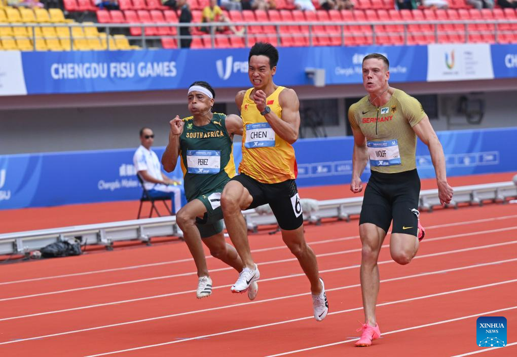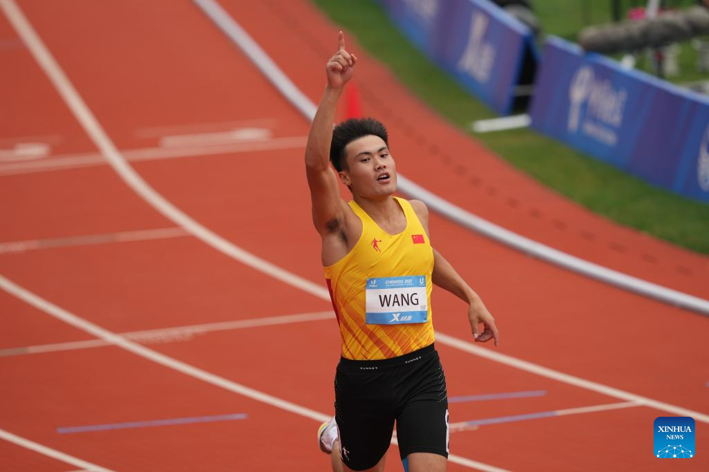 Wang Zhipeng of China celebrates during the 100m event of the Athletics Men's Decathlon competition at the 31st FISU Summer World University Games in Chengdu, southwest China's Sichuan Province, Aug. 2, 2023. (Xinhua/Li Jing)
