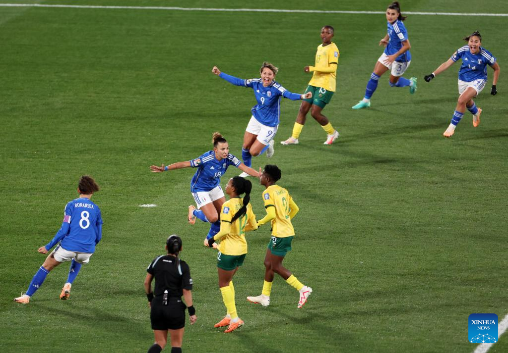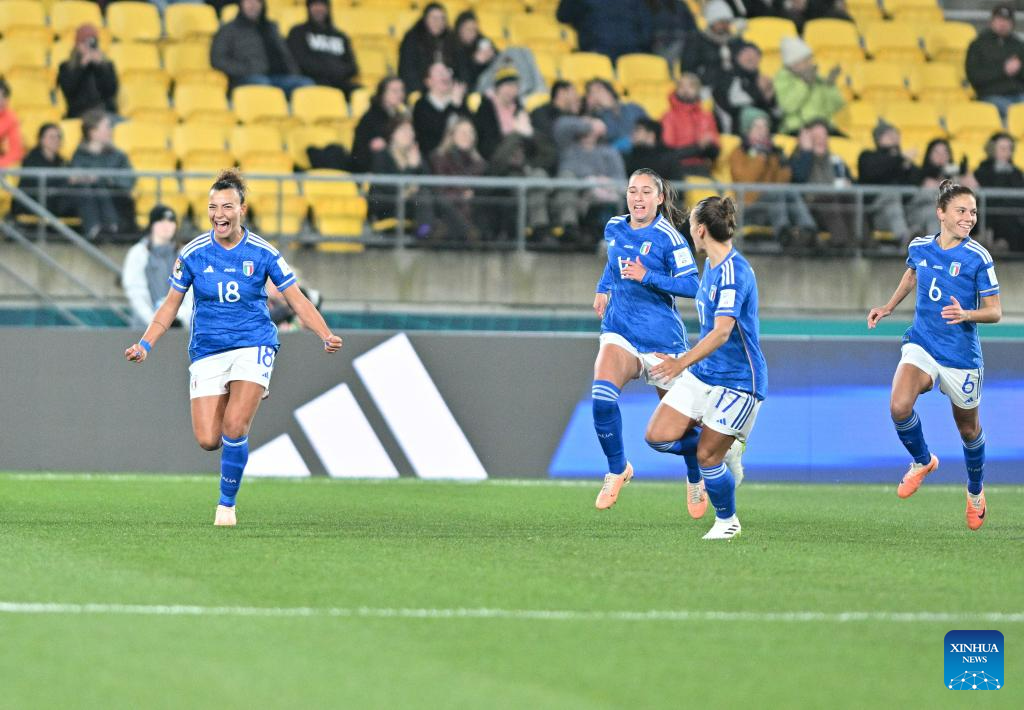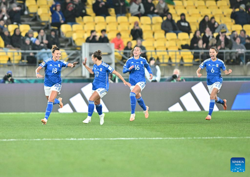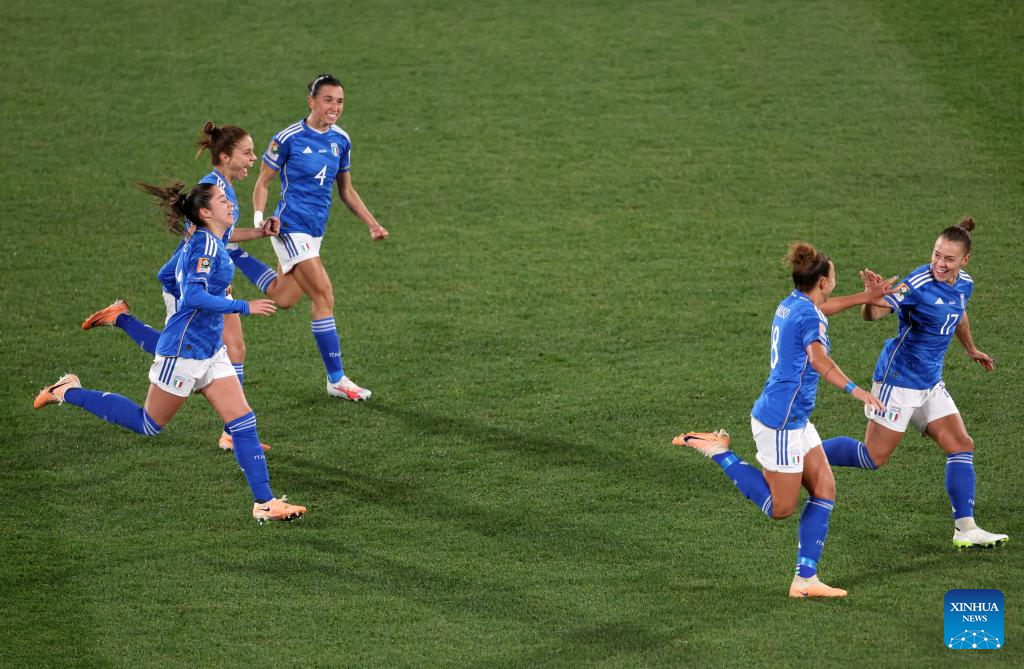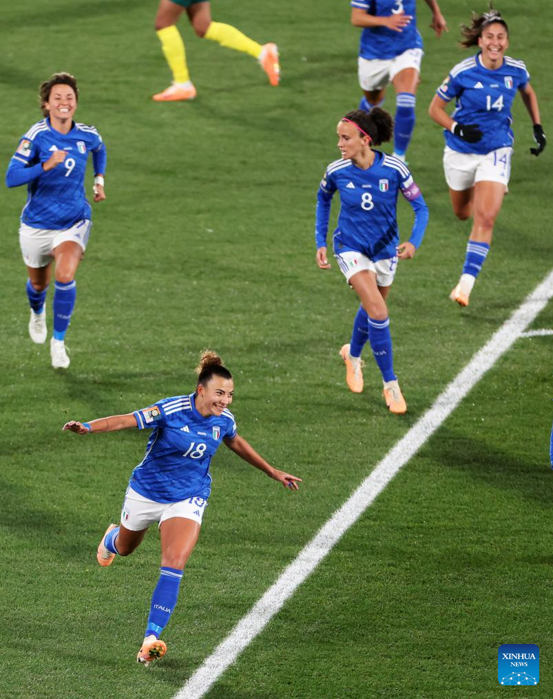 Arianna Caruso (1st L) of Italy celebrates after scored a penalty goal during the group G match between South Africa and Italy at the FIFA Women's World Cup 2023 in Wellington, New Zealand, Aug. 2, 2023. (Xinhua/Guo Lei)