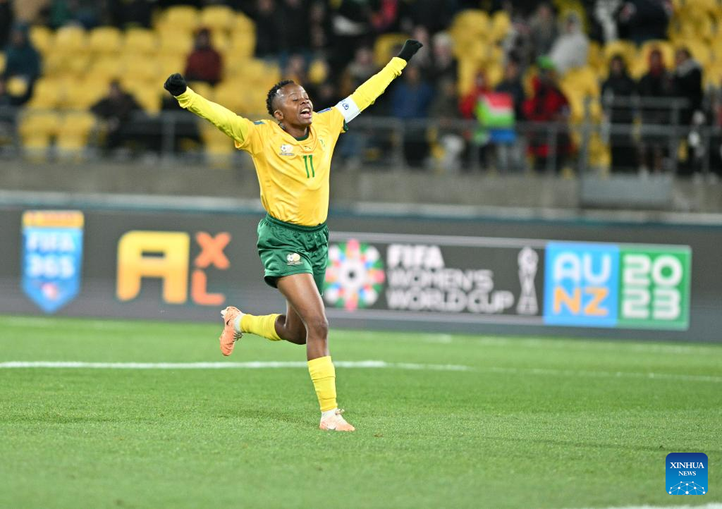 Thembi Kgatlana of South Africa celebrates as Benedetta Orsi of Italy scored an own goal during the group G match between South Africa and Italy at the FIFA Women's World Cup 2023 in Wellington, New Zealand, Aug. 2, 2023. (Xinhua/Guo Lei)