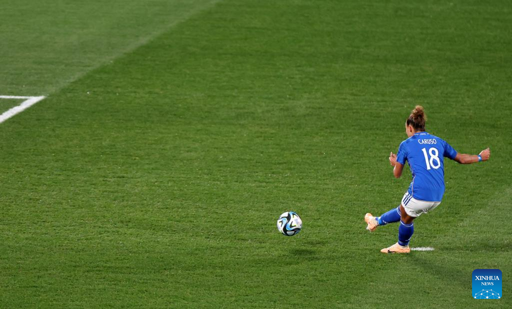 Arianna Caruso of Italy scores a penalty goal during the group G match between South Africa and Italy at the FIFA Women's World Cup 2023 in Wellington, New Zealand, Aug. 2, 2023. (Xinhua/Qin Lang)