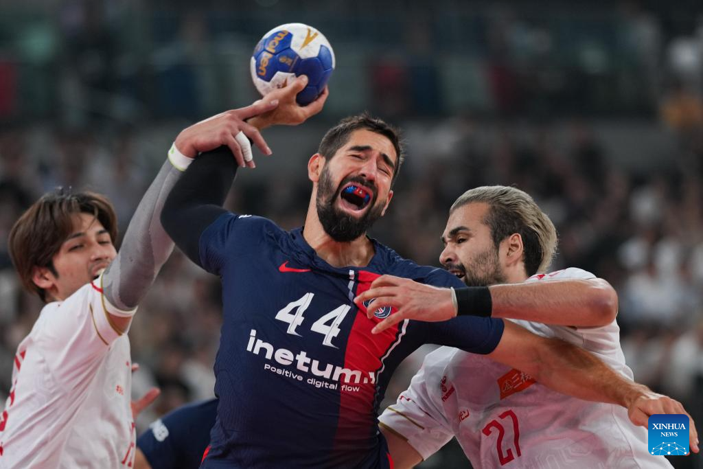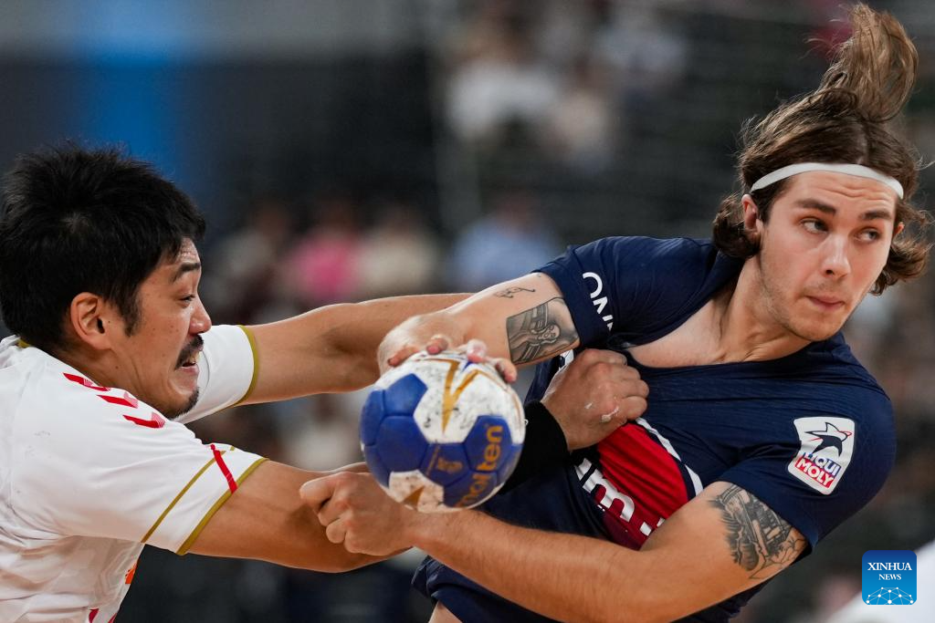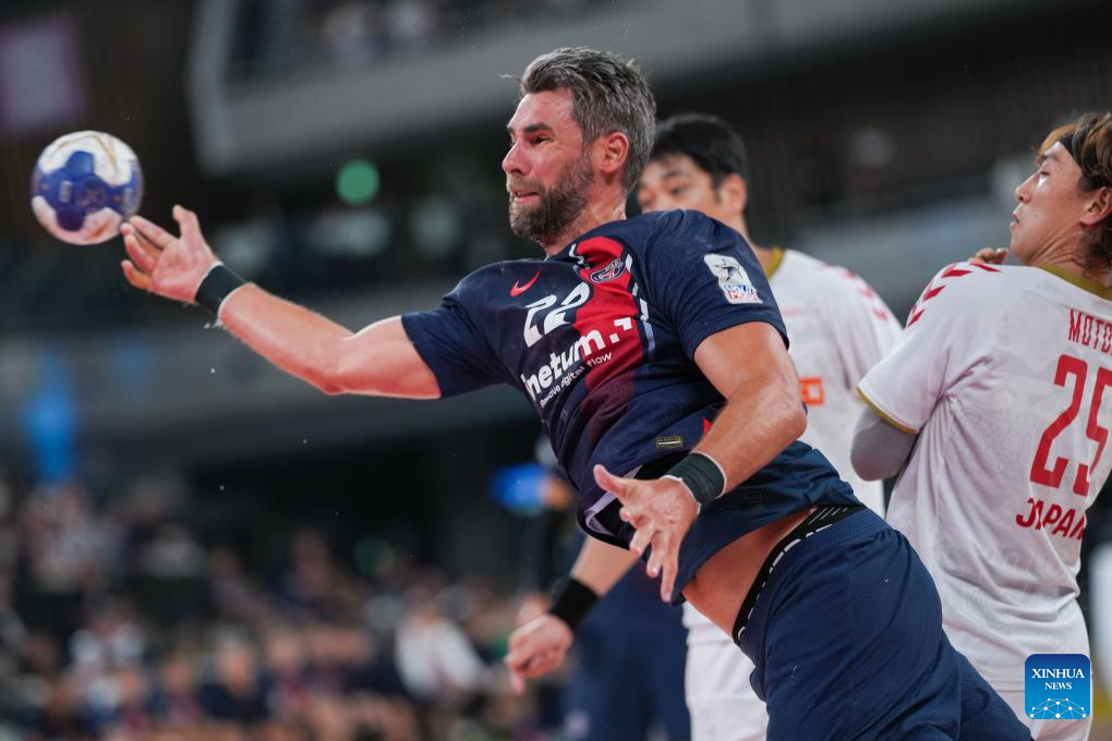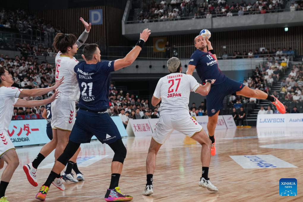 Paris Saint-Germain's Luka Karabati competes during a friendly handball match between Paris Saint-Germain FC and Japan national team at Japan Ariake Area in Tokyo, Japan, Aug. 2, 2023. (Xinhua/Zhang Xiaoyu)