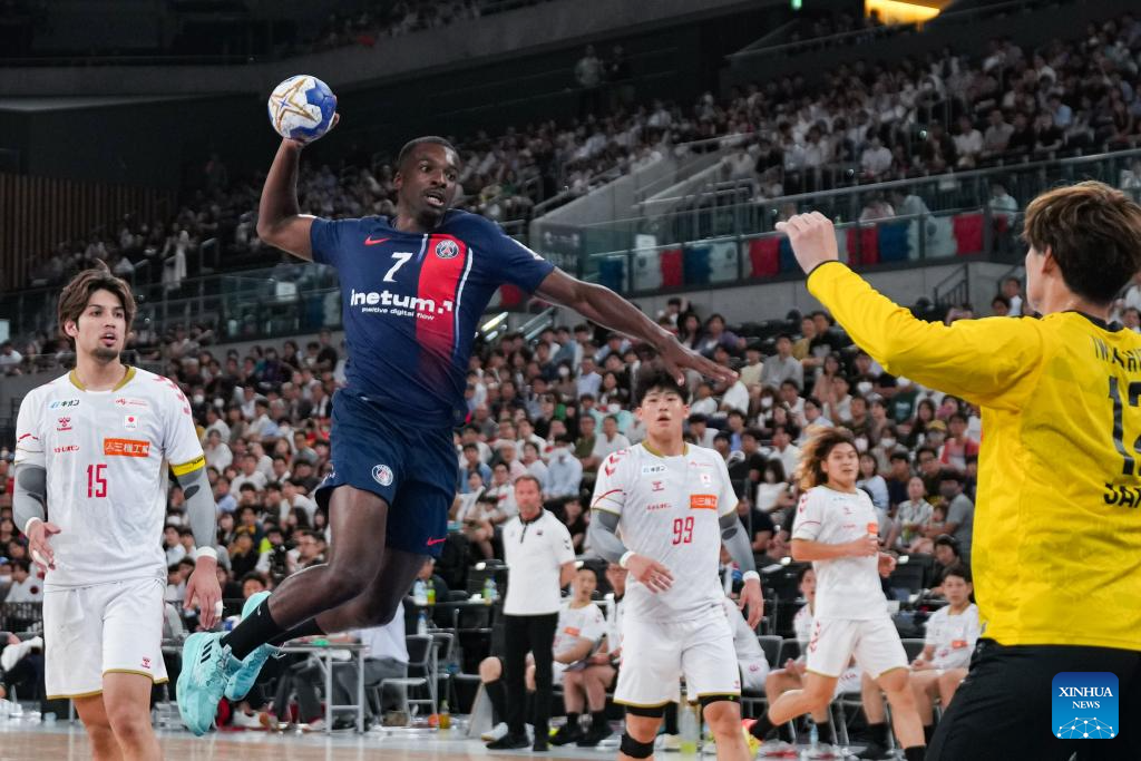 Paris Saint-Germain's Sadou N'Tanzi (2nd L) competes during a friendly handball match between Paris Saint-Germain FC and Japan national team at Japan Ariake Area in Tokyo, Japan, Aug. 2, 2023. (Xinhua/Zhang Xiaoyu)