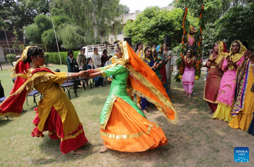 Women in traditional Punjabi attire celebrate the Teej Festival in Amritsar district of India's northern Punjab state, Aug. 4, 2023. (Str/Xinhua)