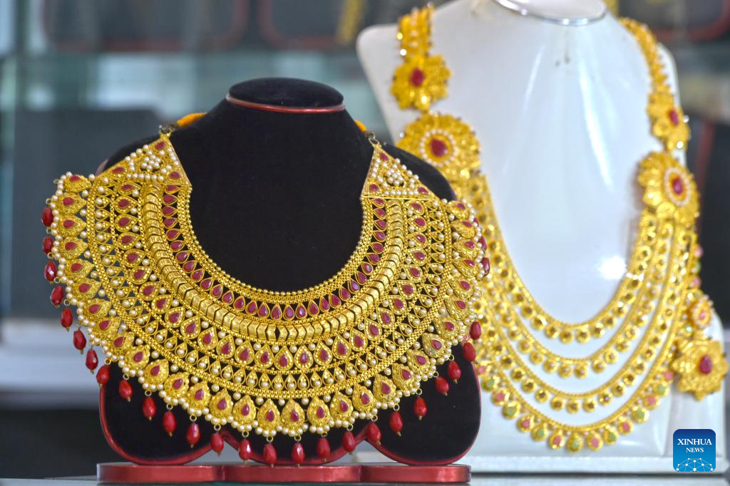This photo taken on Aug. 2, 2023 shows handmade jewelry products at a shop at Vakurta village in Savar, on the outskirts of Dhaka, Bangladesh. Vakurta is a place highly regarded for its exquisite jewelry and ornaments made by local artisans using methods passed on from one generation to the next. (Xinhua)