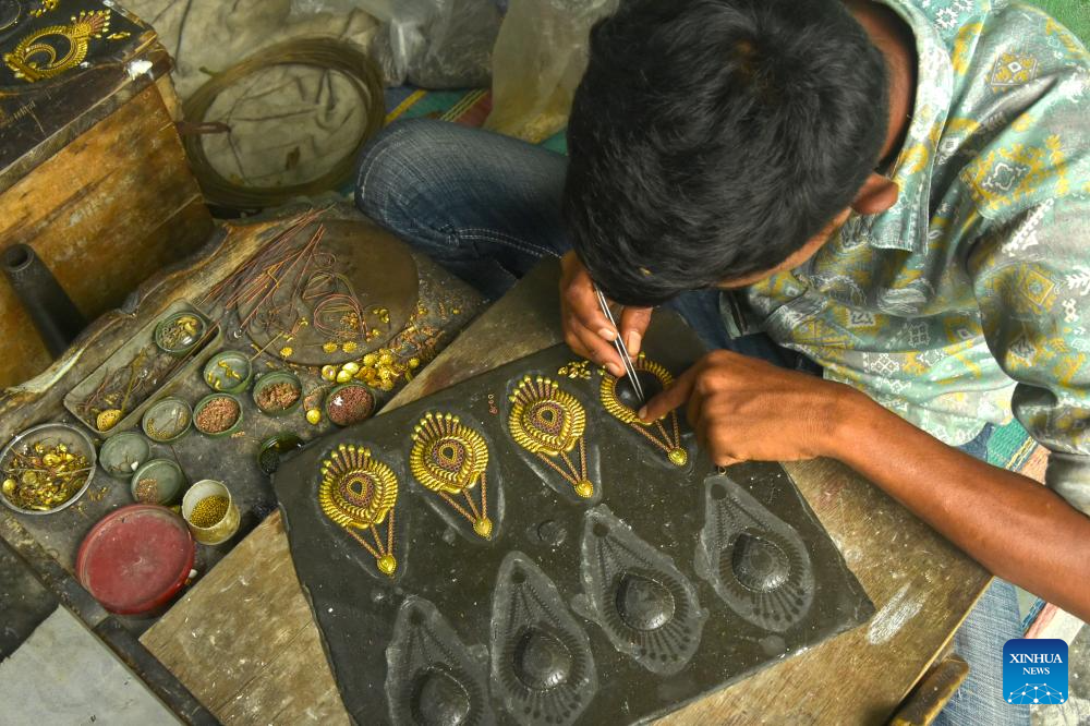 An artisan makes components of a jewelry product at his workshop at Vakurta village in Savar, on the outskirts of Dhaka, Bangladesh on Aug. 2, 2023. Vakurta is a place highly regarded for its exquisite jewelry and ornaments made by local artisans using methods passed on from one generation to the next. (Xinhua)