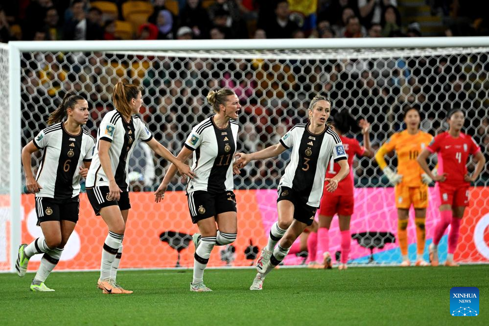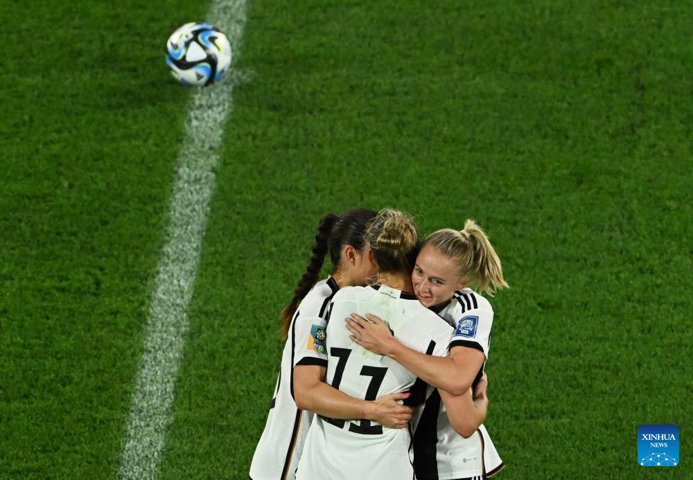 Players of Germany celebrate during the Group H match between South Korea and Germany at the 2023 FIFA Women's World Cup in Brisbane, Australia, Aug. 3, 2023. (Xinhua/Li Yibo)