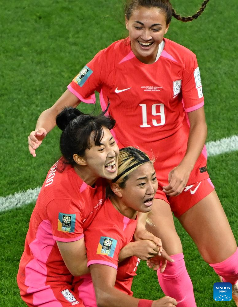 Cho Sohyun (R) of South Korea celebrates scoring during the Group H match between South Korea and Germany at the 2023 FIFA Women's World Cup in Brisbane, Australia, Aug. 3, 2023. (Xinhua/Zhang Chen)