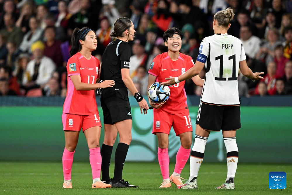 Ji Soyun (2nd R) of South Korea communicates with Alexandra Popp (1st R) of Germany during the Group H match between South Korea and Germany at the 2023 FIFA Women's World Cup in Brisbane, Australia, Aug. 3, 2023. (Xinhua/Xiong Qi)
