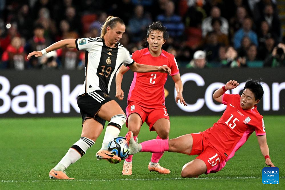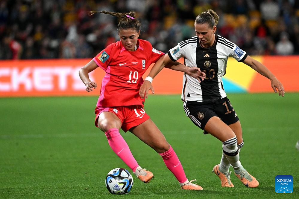 Cho Sohyun (L) of South Korea competes during the Group H match between South Korea and Germany at the 2023 FIFA Women's World Cup in Brisbane, Australia, Aug. 3, 2023. (Xinhua/Li Yibo)