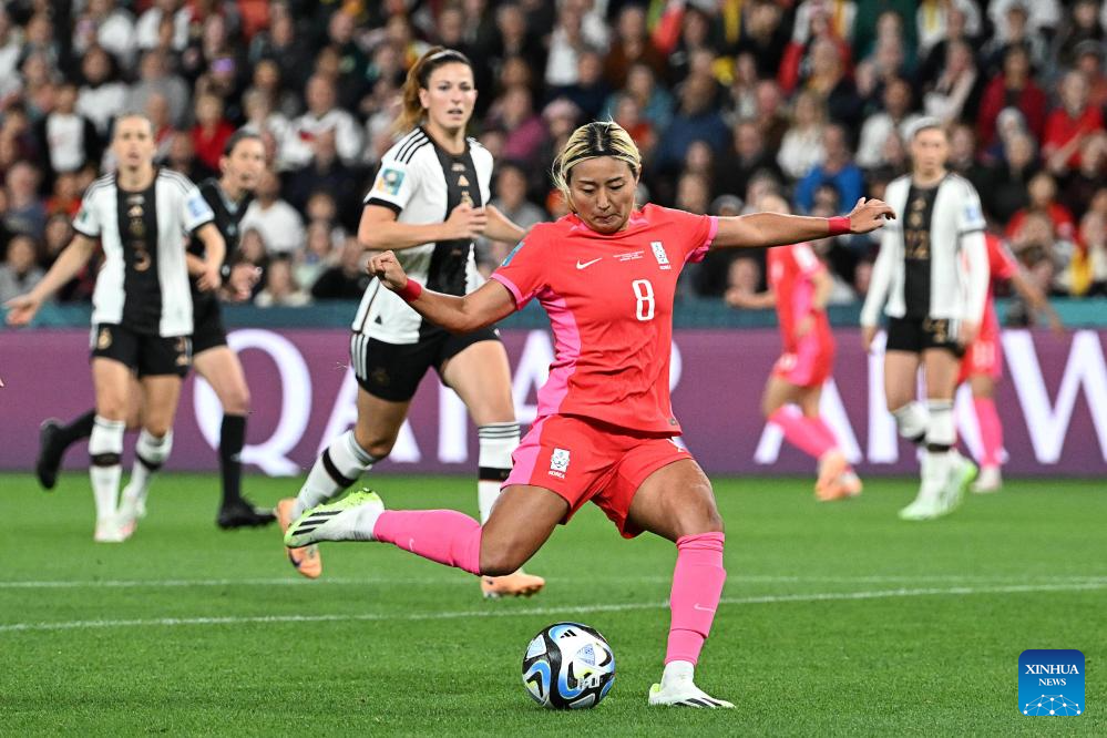 Cho Sohyun (R) of South Korea shoots to score the Group H match between South Korea and Germany at the 2023 FIFA Women's World Cup in Brisbane, Australia, Aug. 3, 2023. (Xinhua/Xiong Qi)